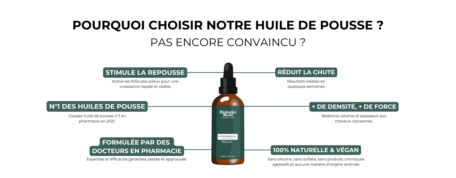 Pour mener à bien une cure pour favoriser la repousse de vos cheveux, il faut faire une cure complémentaire par voie orale de 3 à 6 mois accompagnée d'une cure par voie externe comme la cure d'Accelerator oil